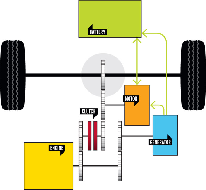 Through-the-wheels hybrids are a type of parallel hybrid that uses a conventional powertrain on one axle (typically front), with an electric motor/generator installed on the other (typically rear) axle. This requires zero modification to the ICE and transmission, and gives the benefit of all-wheel-drive. Downsides include the fact that handling can be weird if the hybrid system is heavily leaned upon, and the fact that the electric motor doesn’t get the benefit of multiple gears to optimize its power delivery.