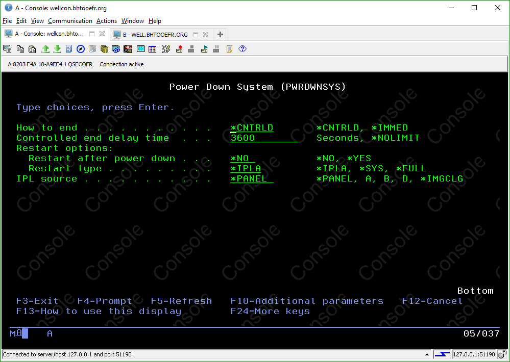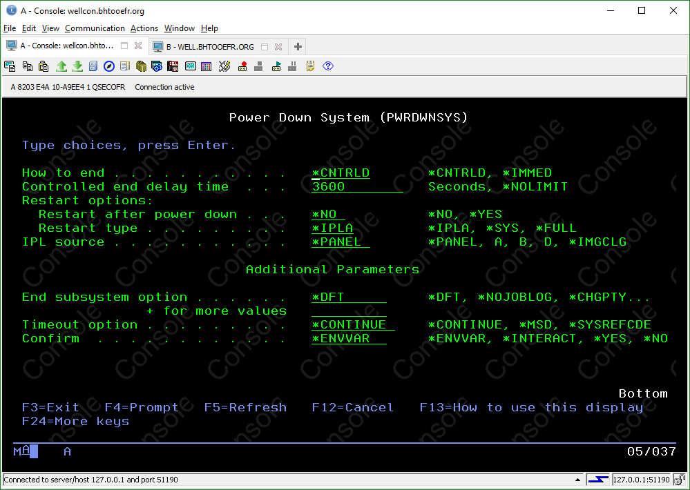 I’ll use PWRDWNSYS as another example, as it shows another part of this. I can choose how I want to power down, the delay, whether to restart, and where to start from next time – the common options.