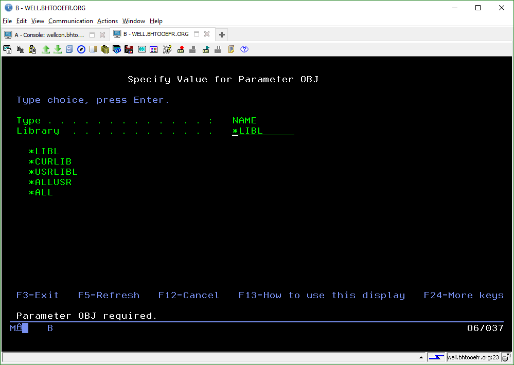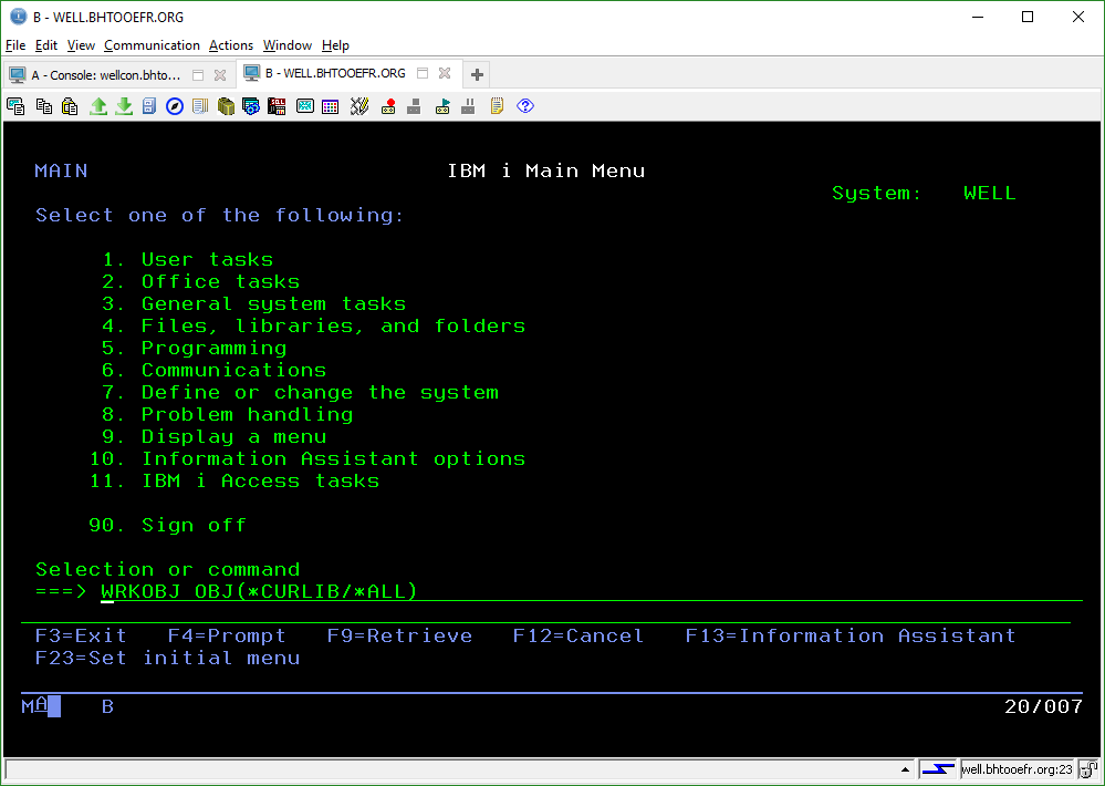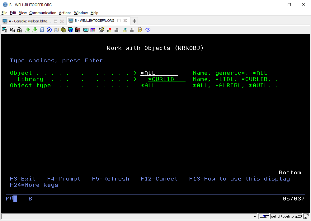 Now I know that I can just enter this, and get all objects in my current library. Or, I can change that to, say, WRKOBJ OBJ(QGPL/*ALL), to get all objects in the IBM-provided general purpose library.